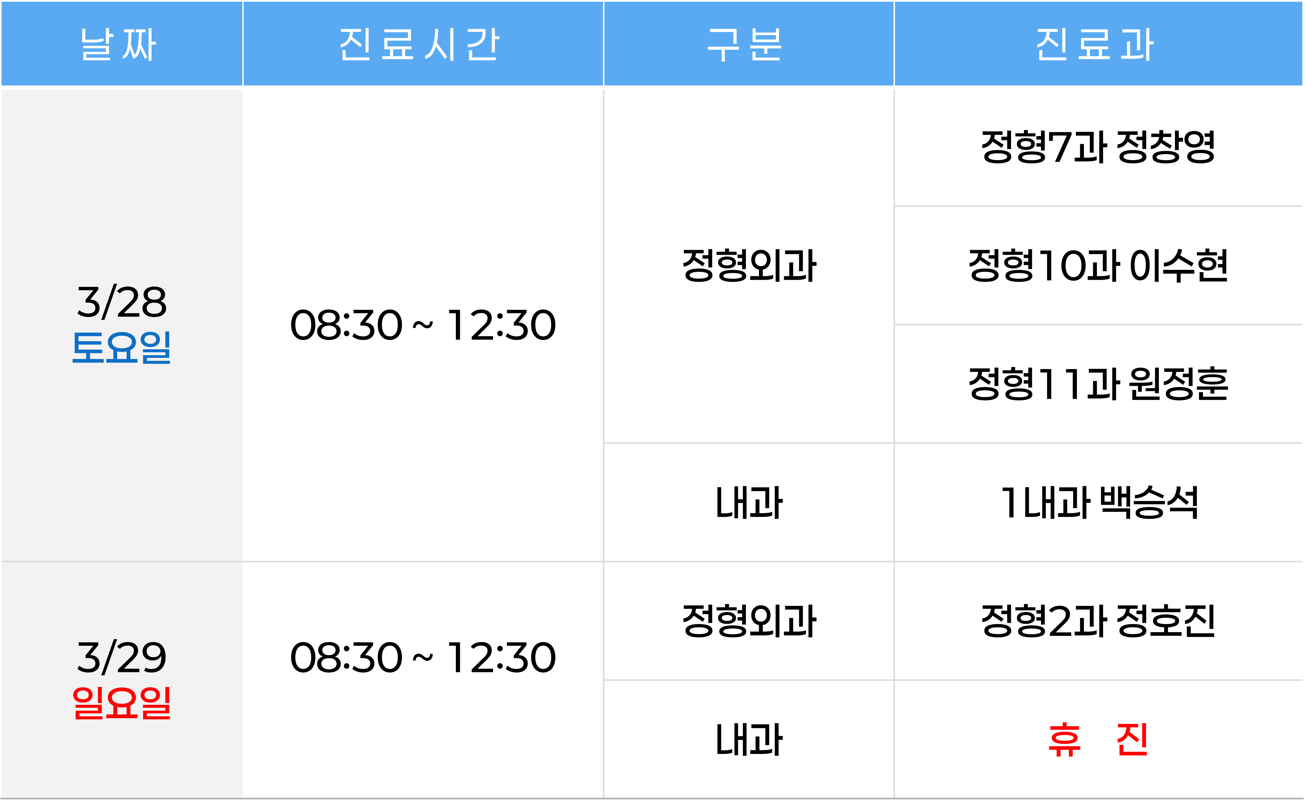 | 제목 | ◆ 주말 진료 안내 ◆ 2026년 3월 28일(토) - 29일(일) | ||||