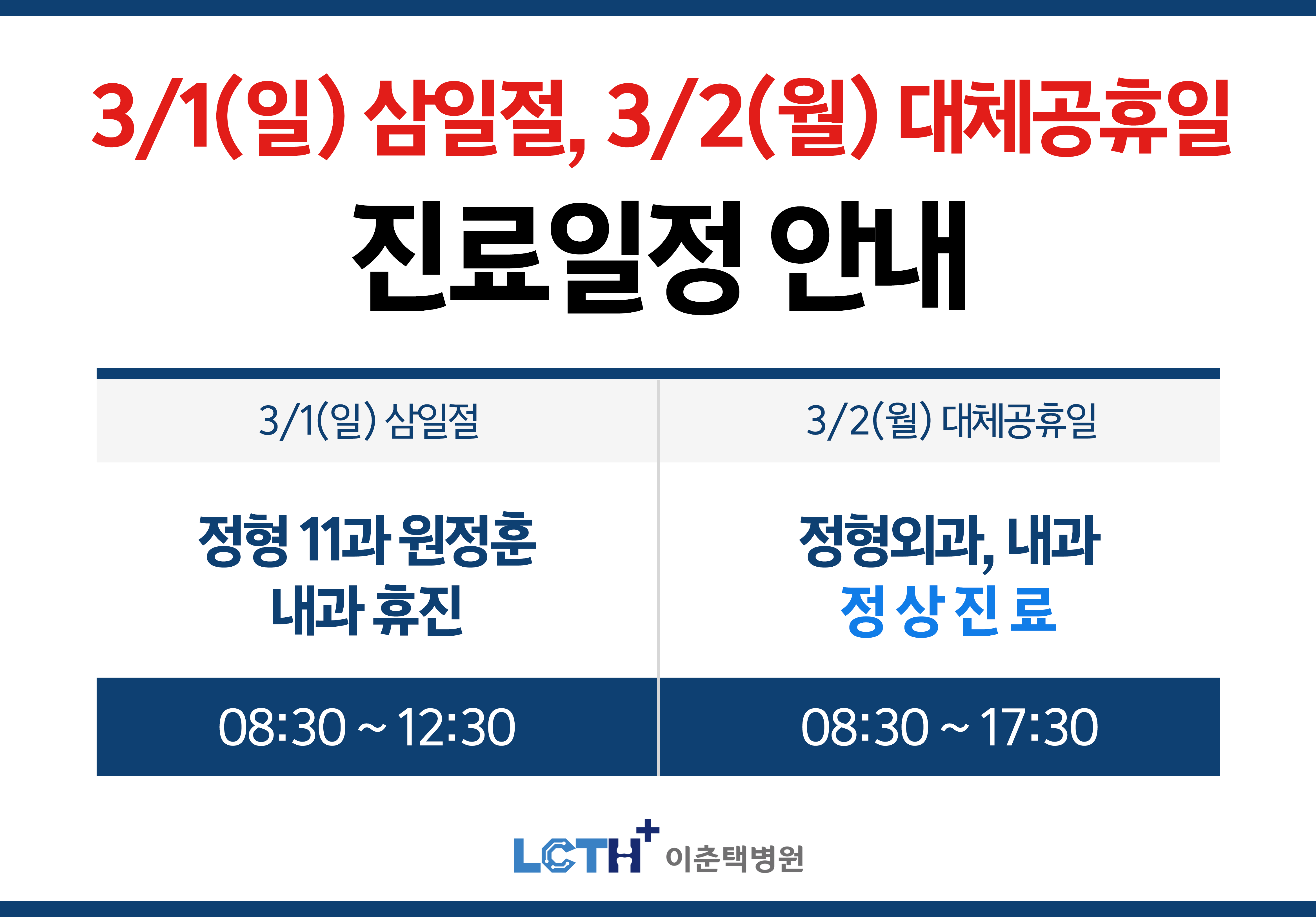 | 제목 | 3/1(일) 삼일절, 3/2(월) 대체공휴일 진료안내 | ||||