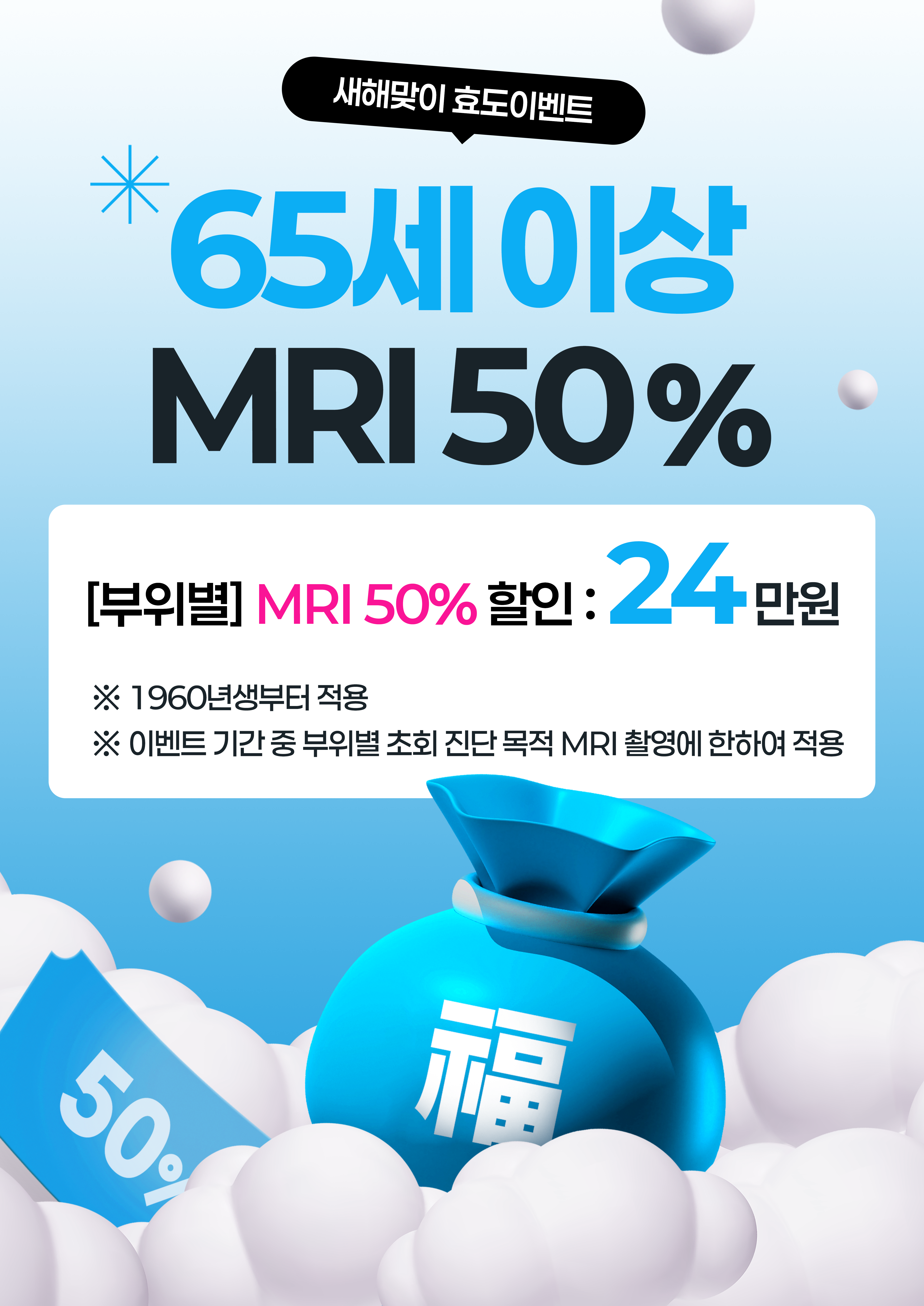 | 제목 | [새해맞이 효도 이벤트] 65세 이상 어르신 MRI 검사비 50% 인하 | ||||