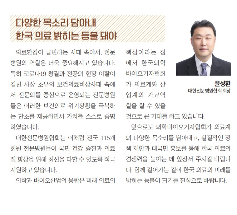 함께 걸어가는 길이 한국 의료의 미래를 밝히는 등불이 되기를 진심으로 바랍니다. 윤성환 이춘택병원 병원장 / 대한전문병원협회장