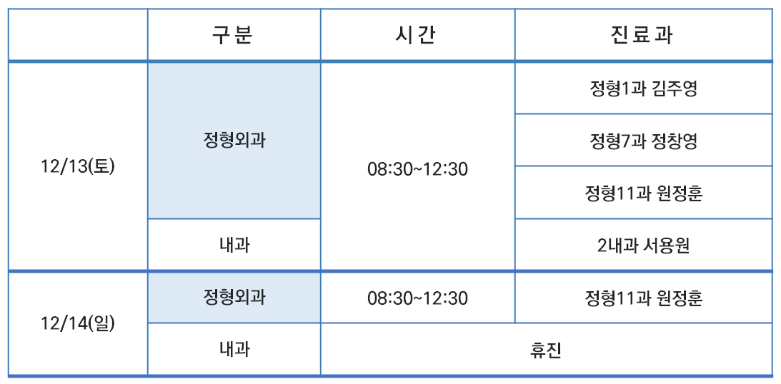 | 제목 | ◆ 주말 진료 안내 ◆ 2025년 12월 13일(토) - 12월 14일(일) | ||||
