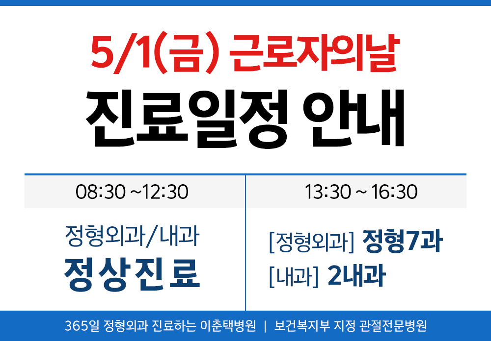 | 제목 | 5/1(금) 근로자의 날 진료안내 [오전: 정상진료/오후: 당직진료] | ||||