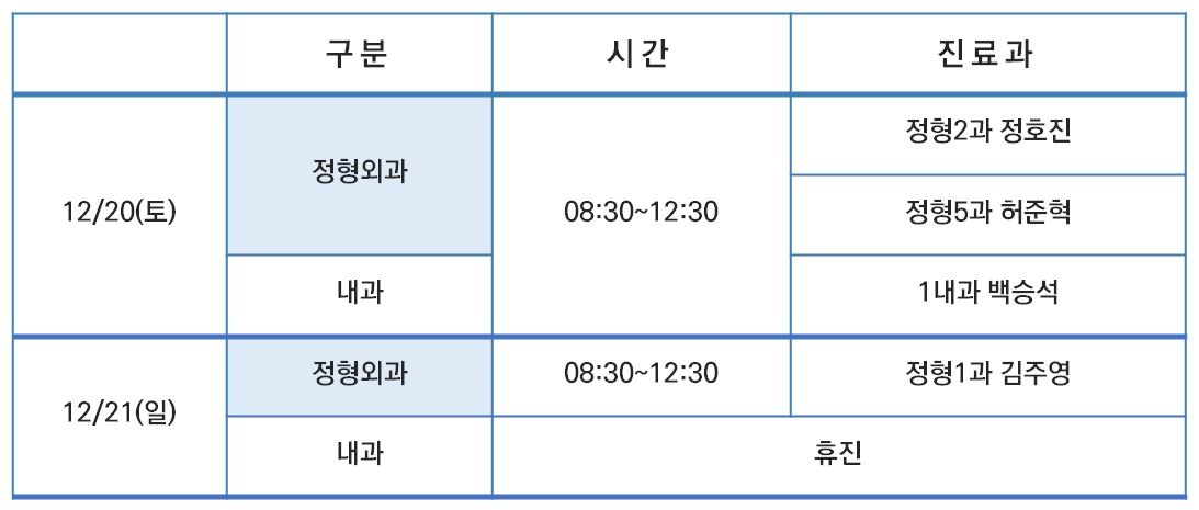 | 제목 | ◆ 주말 진료 안내 ◆ 2025년 12월 20일(토) - 12월 21일(일) | ||||