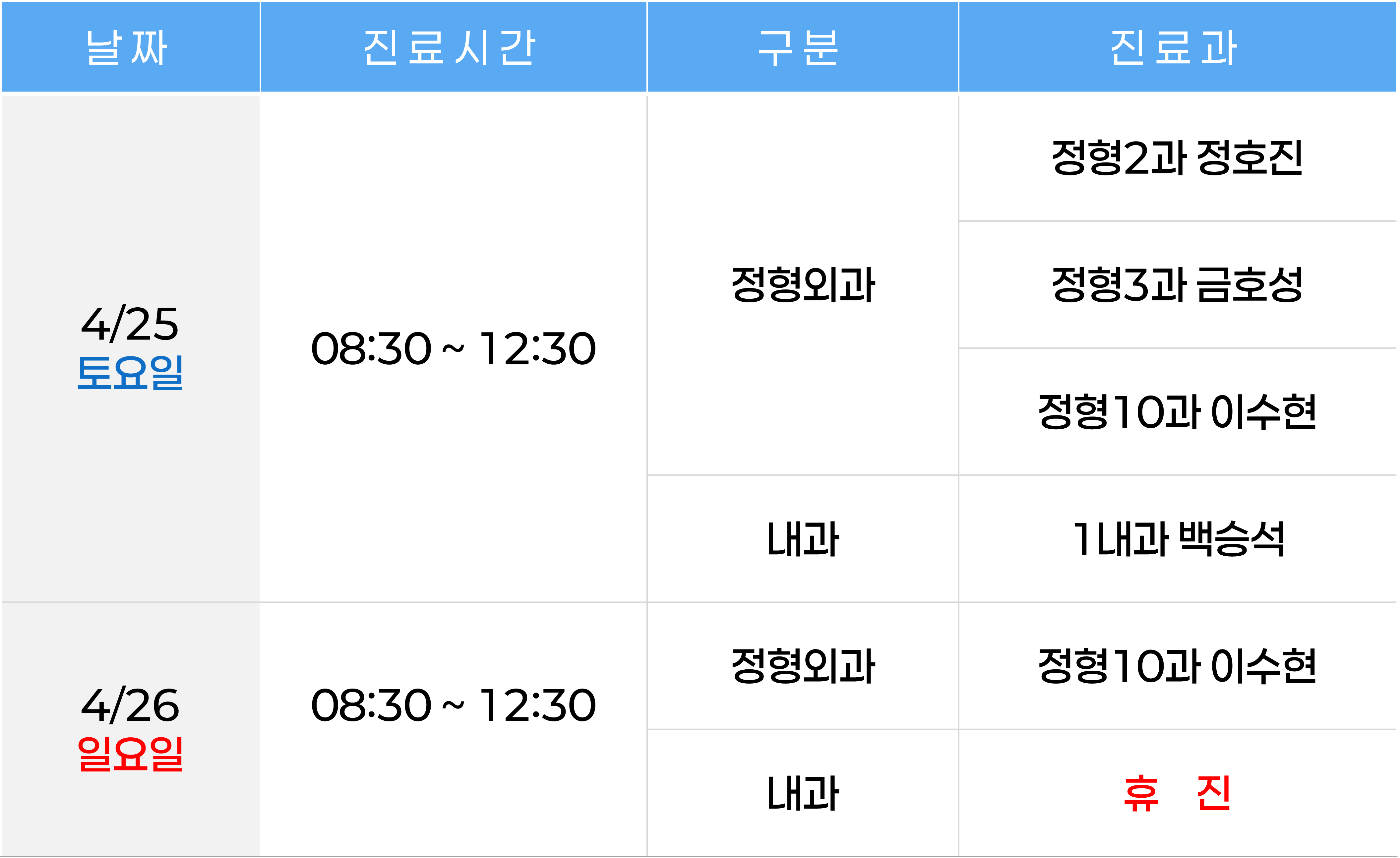 | 제목 | ◆ 주말 진료 안내 ◆ 2026년 4월 25일(토) - 26일(일) | ||||
