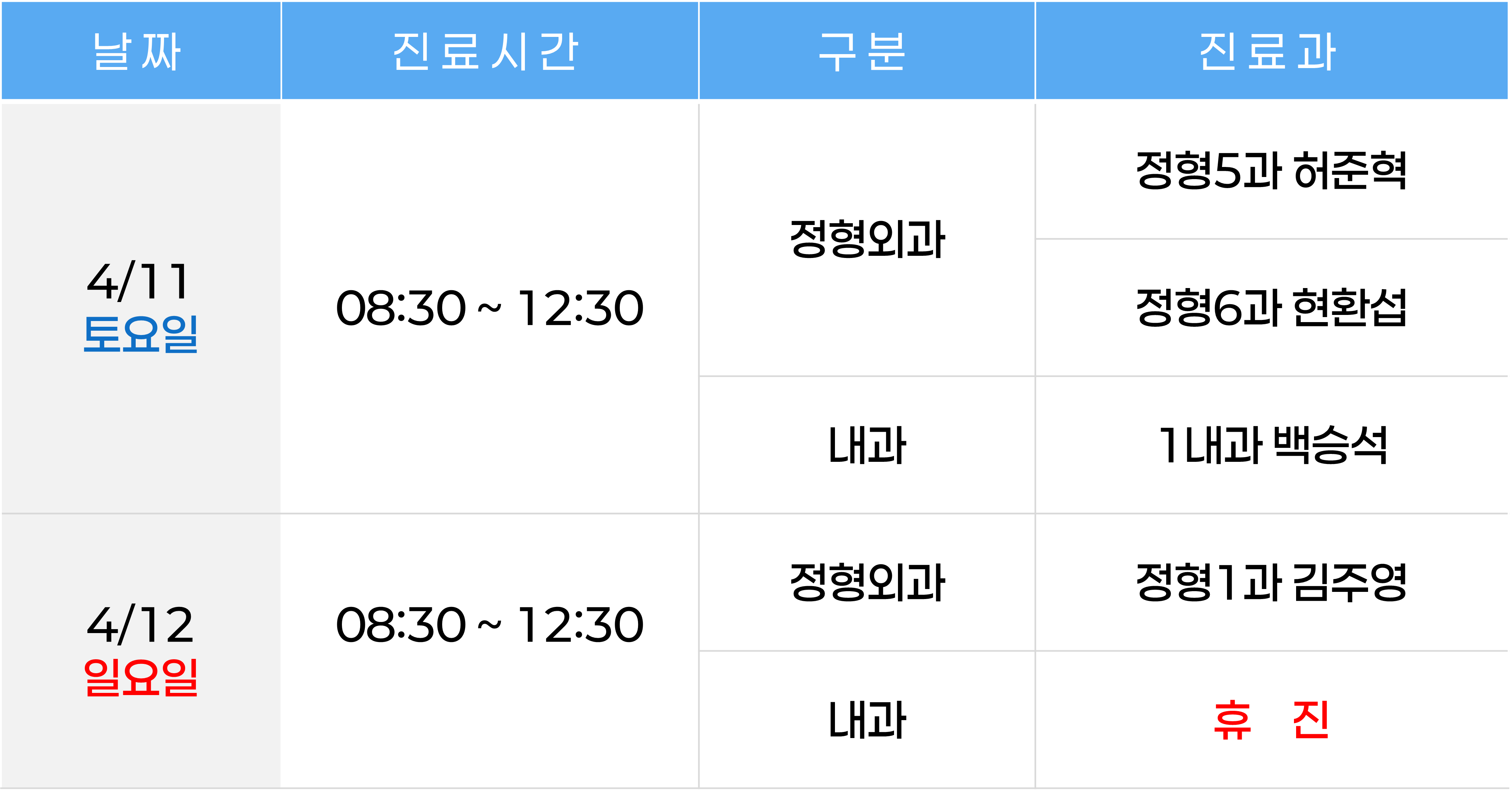 | 제목 | ◆ 주말 진료 안내 ◆ 2026년 4월 11일(토) - 12일(일) | ||||