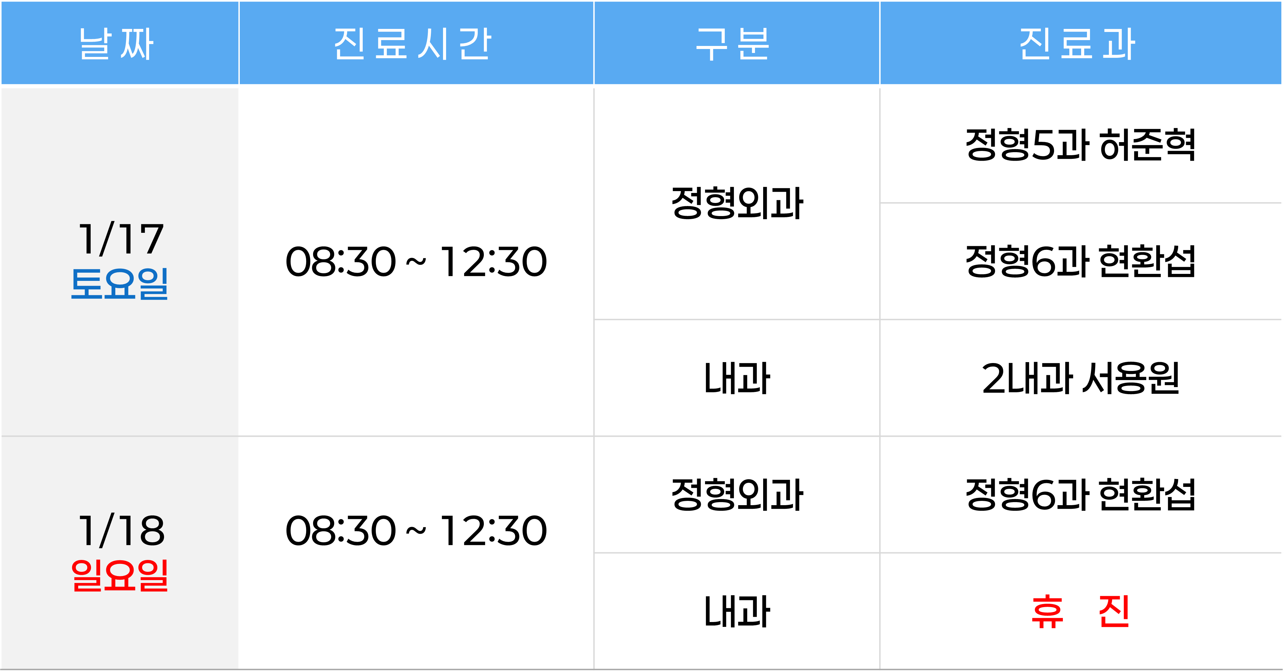 | 제목 | ◆ 주말 진료 안내 ◆ 2025년 1월 17일(토) - 1월 18일(일) | ||||