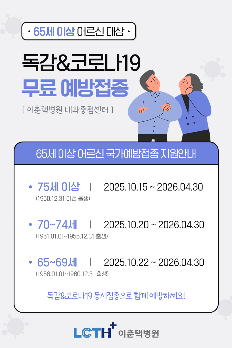 제목 | (65세 이상 어르신) 2025~2026절기 독감 및 코로나19 무료 예방접종 안내드립니다. | ||||