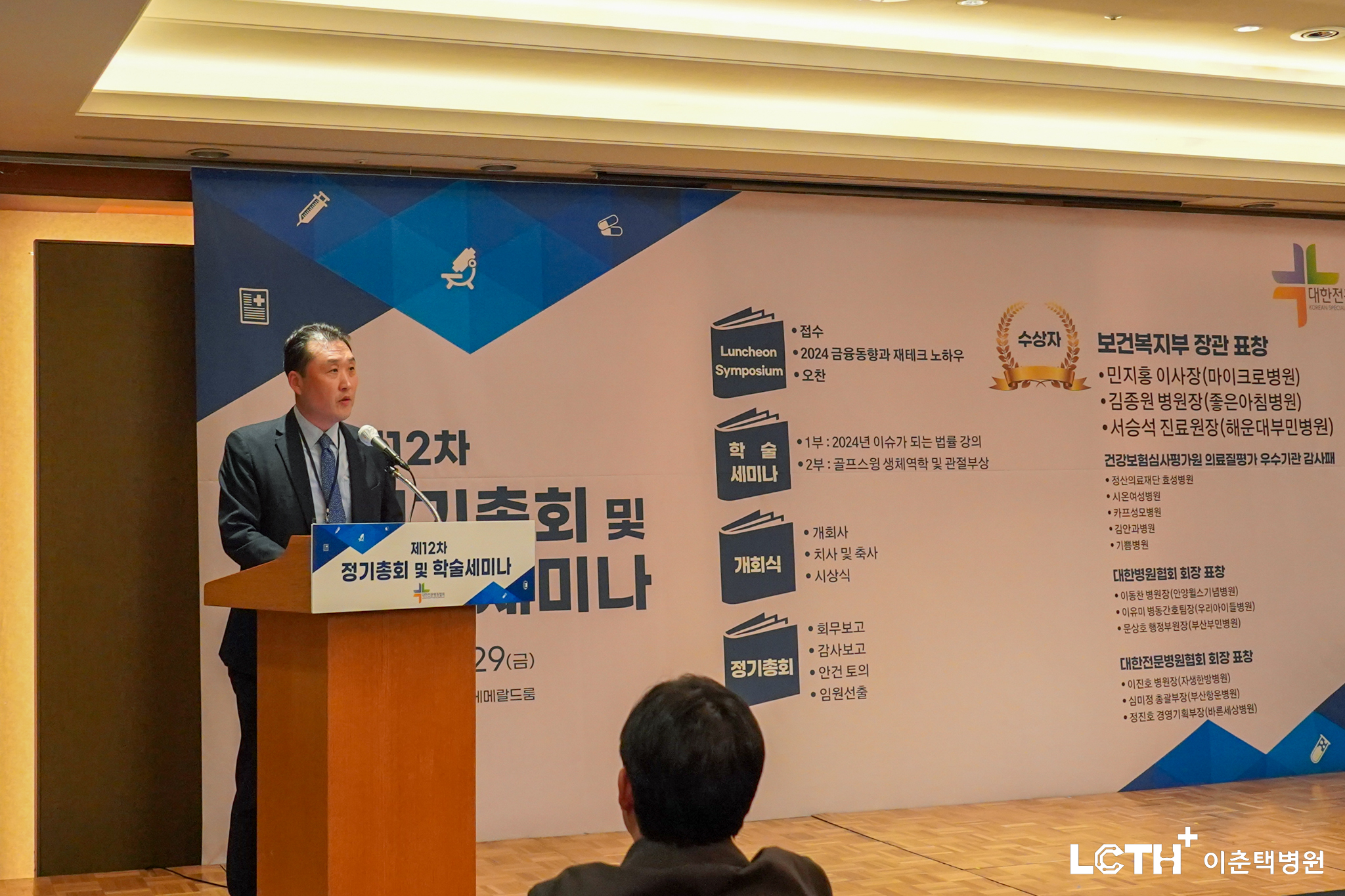 대한전문병원협회 제12차 정기총회 및 학술세미나 일시 : 2024년 3월 29일(금) 12:00 ~ 장소 : 롯데호텔 2층 에메랄드룸 [학술세미나] ▶ 1부 - 최근 의료 관련 법적 사례 ▶ 2부 - 좌장 : 윤성환 학술위원장(이춘택병원장) - 골프 스윙 생체역학 [정기총회] ▶ 차기 협회장 선출 - 윤성환 병원장, 제5기 대한전문병원협회장 선임 |